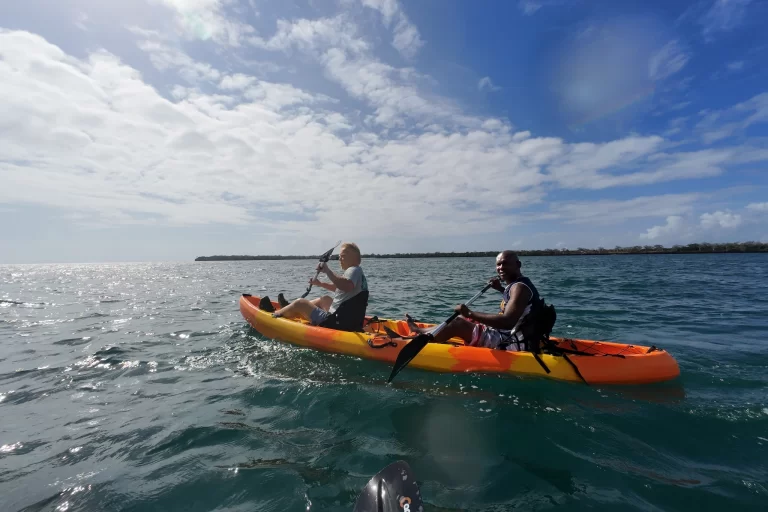 Catch the tides right and you can stop along the shore to explore tidal pools and snorkel on the edges. Dolphins often pass through the channel in the early morning as they go back out to sea and you can paddle right along side them on the Wasini Island side of the channel.